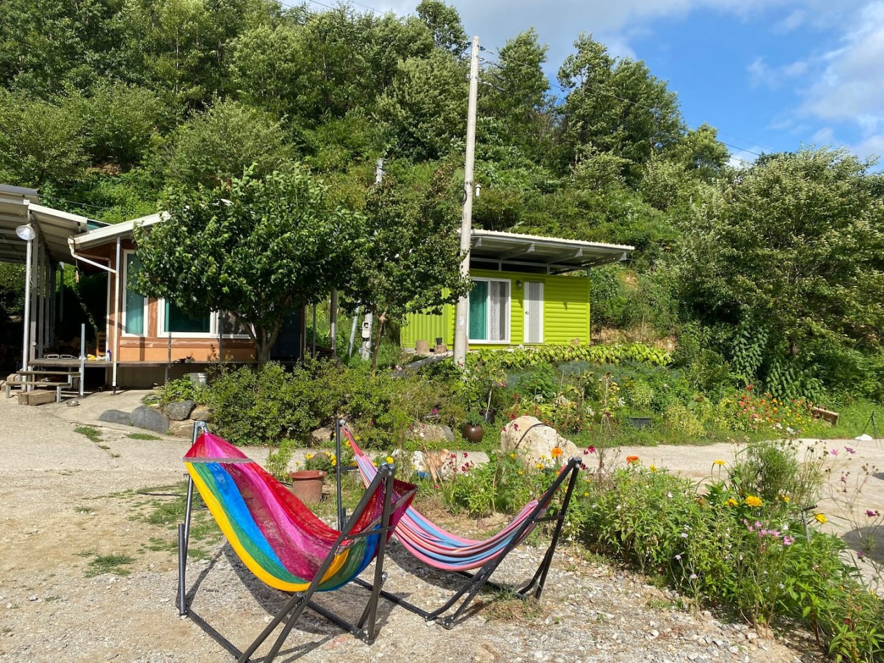 - 원룸형 숙소로 2인이 사용하기에 적합합니다. 최대 4인까지 이용할 수 있습니다. - 방 안에는 냉장고가 없어요! 숙소 앞에 있는 공용 냉장고를 사용하시면 됩니다. - 마당에 있는 테이블, 캠핑의자는 사용 가능합니다. - 미니골프장이 있습니다. 골프를 좋아하시는 분들 자유롭게 이용하세요. - 뒷산을 따라 가벼운 산책을 할 수 있어요. 등산로가 있습니다. - 온실카페에는 테이블과 의자가 준비되어 있습니다.